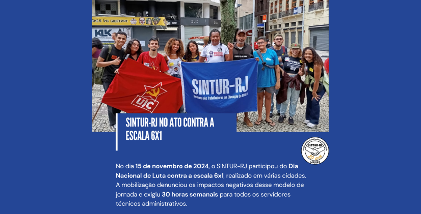 No dia 15 de novembro de 2024, o SINTUR-RJ participou do Dia Nacional de Luta contra a escala 6x1, realizado em várias cidades. A mobilização denunciou os impactos negativos desse modelo de jornada e exigiu 30 horas semanaiNo dia 15 de novembro de 2024, o SINTUR-RJ participou do Dia Nacional de Luta contra a escala 6x1, realizado em várias cidades. A mobilização denunciou os impactos negativos desse modelo dAe jornada e exigiu 30 horas semanais para todos os servidores técnicos administrativos.s para todos os servidores técnicos administrativos.