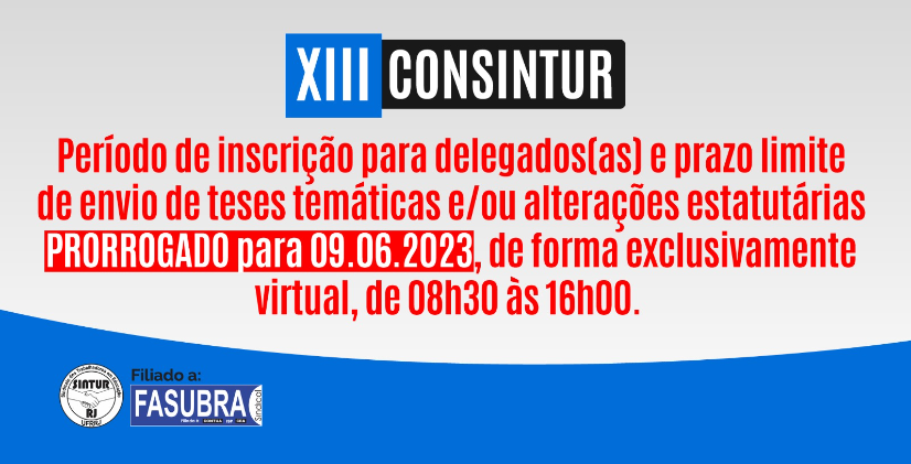 A Comissão Organizadora, no uso de suas atribuições legais, de acordo com os artigos 14º ao 23º do Estatuto, convoca os trabalhadores (as) associados (as) do SINTUR-RJ para participar do XIII CONSINTUR.
