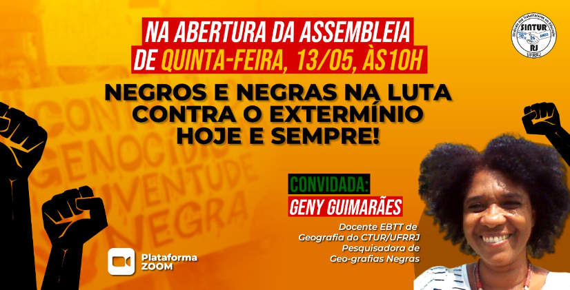 Na abertura da assembleia geral de quinta-feira, 13 de maio, a partir de 10h00, contaremos com a presença da professora Geny Guimarães, com o ponto de pauta "Negras e negros na luta contra o extermínio hoje e sempre".