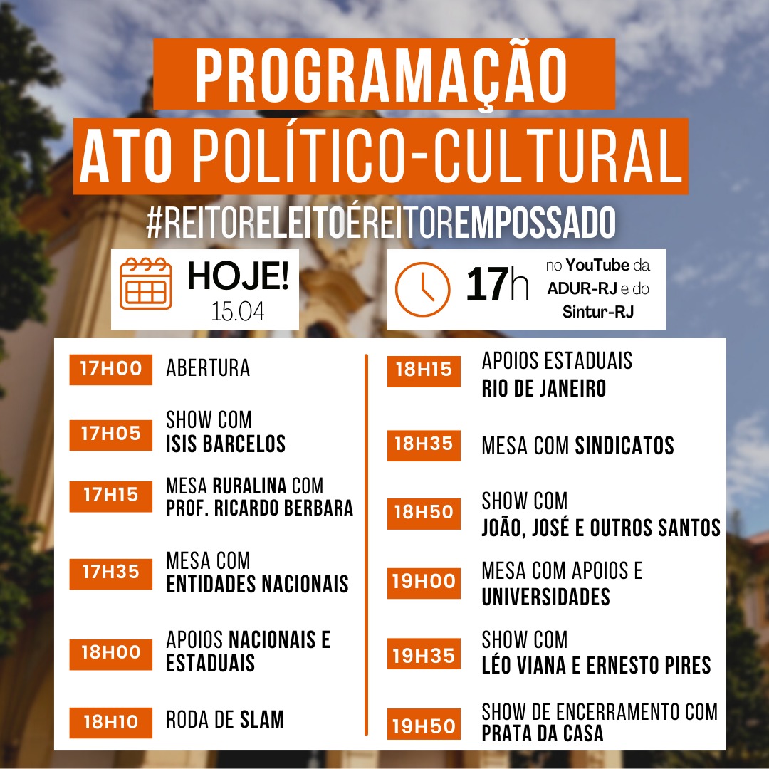 A partir das 17h, acontecerá o ATO POLÍTICO-CULTURAL #ReitorEleitoÉReitorEmpossado, em defesa da autonomia universitária e da democracia!