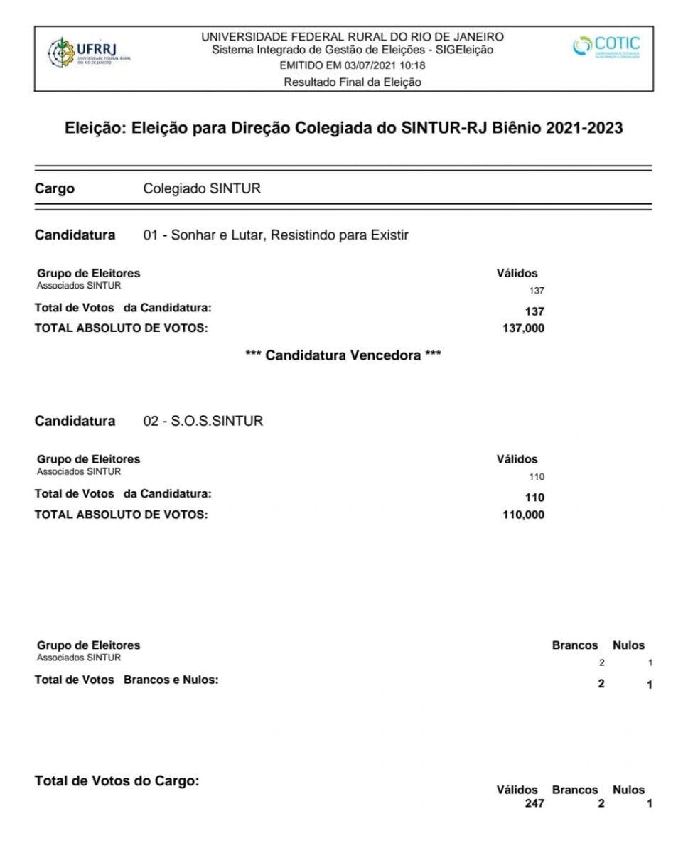 Resultado final da Eleição Colegiada do SINTUR-RJ - BIÊNIO 2021 - 2023