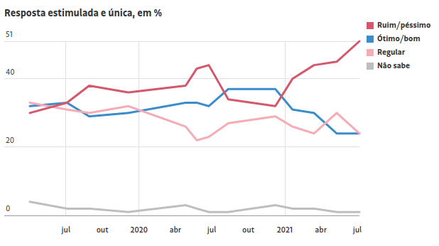 Segundo a pesquisa, diminuiu a quantidade de pessoas que consideram o governo regular e aumentou quem considera Bolsonaro como ruim e péssimo. Em maio, 30% da população classificava o governo como regular, agora, a pesquisa apontou 24%. Já os que consideravam ruim e péssimo eram 45% e agora totalizam em 51% da população brasileira. A taxa dos que consideram ótimo e bom que não mudou. Em maio, eram 24%, o que se manteve. O mesmo ocorreu com quem afirmou não saber responder, que continuou totalizando em 1%.