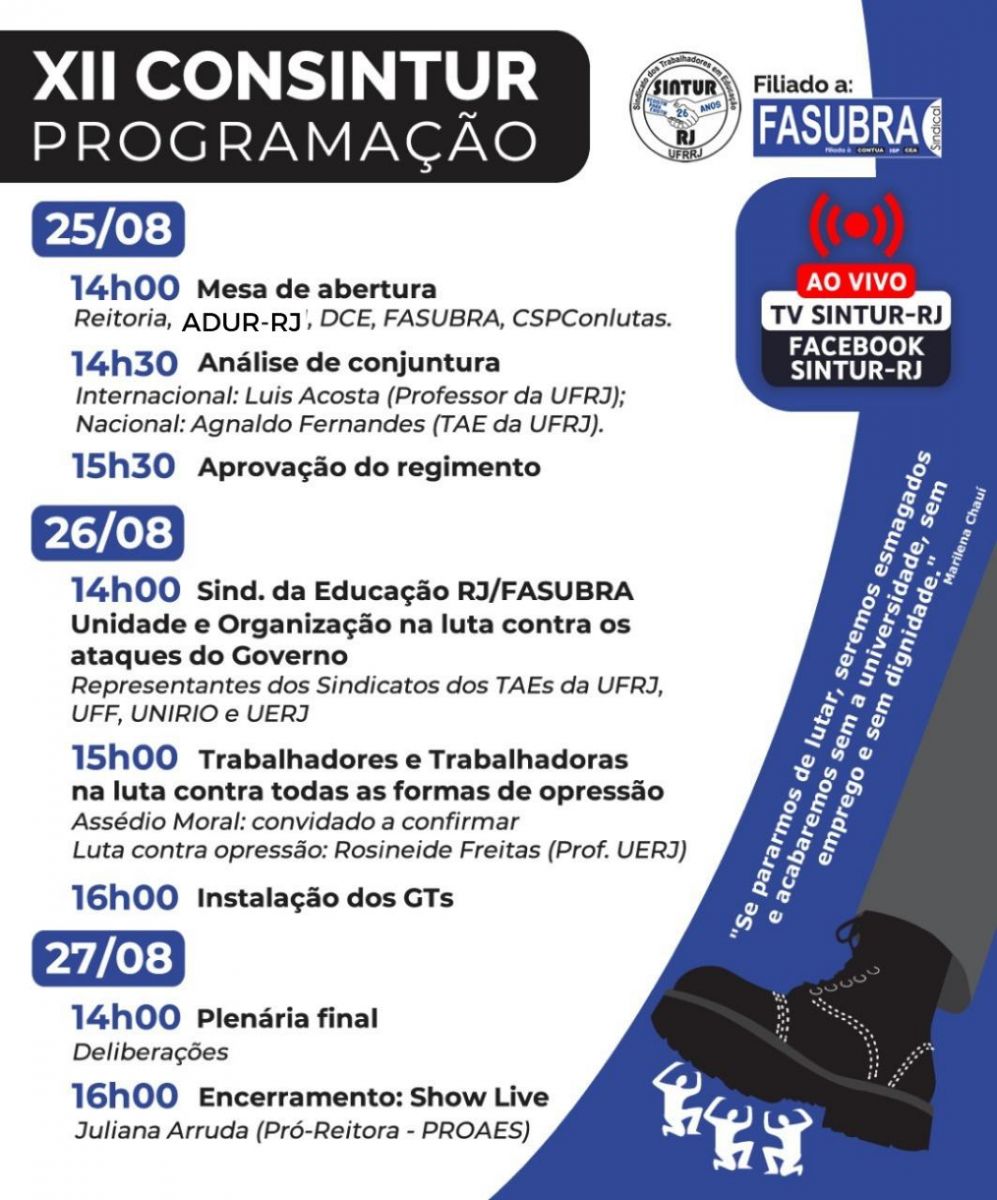 Ainda estamos em Pandemia, seguindo as orientações sanitárias, para preservar a nossa vida. NÃO podemos fazer aglomeração e, por isso, assim como todas as atividades do SINTUR-RJ, o XII CONSINTUR-RJ será Virtual, a ser realizado pela plataforma Zoom nos dias 25, 26 e 27 de Agosto de 2021.