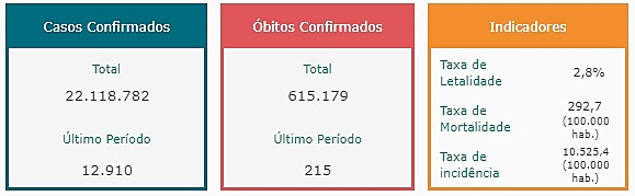 O Brasil superou nessa quinta-feira (2) a marca de 615 mil mortes por covid-19 com as 615.176 novas vítimas registradas nas últimas 24 horas. Isso sem contar a ampla subnotificação. Os dados são do Conselho Nacional dos Secretários de Saúde (Conass). No mesmo período, foram contabilizados 12.910 novos casos, totalizando 22.118.782 desde o início do surto, em março de 2020. Destes, ao menos cinco foram confirmados como sendo da mais recente variante, a ômicron.