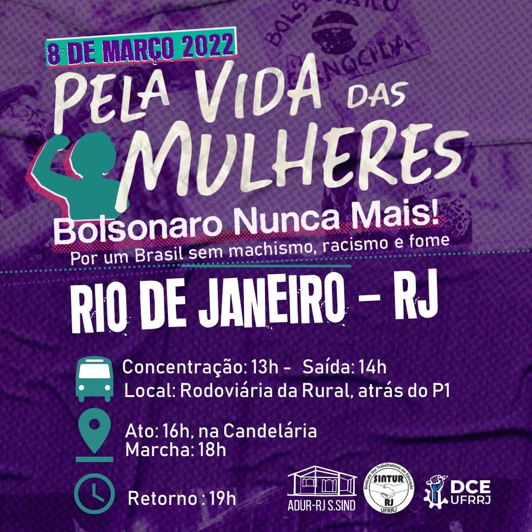 O SINTUR-RJ, a ADUR-RJ e o DCE-RURAL convoca todas, todos e todes a ocuparem as ruas no dia 8 de março na luta contra o machismo, o combate à feminização da pobreza e a todas as ações que agravam a situação das mulheres no Brasil.
