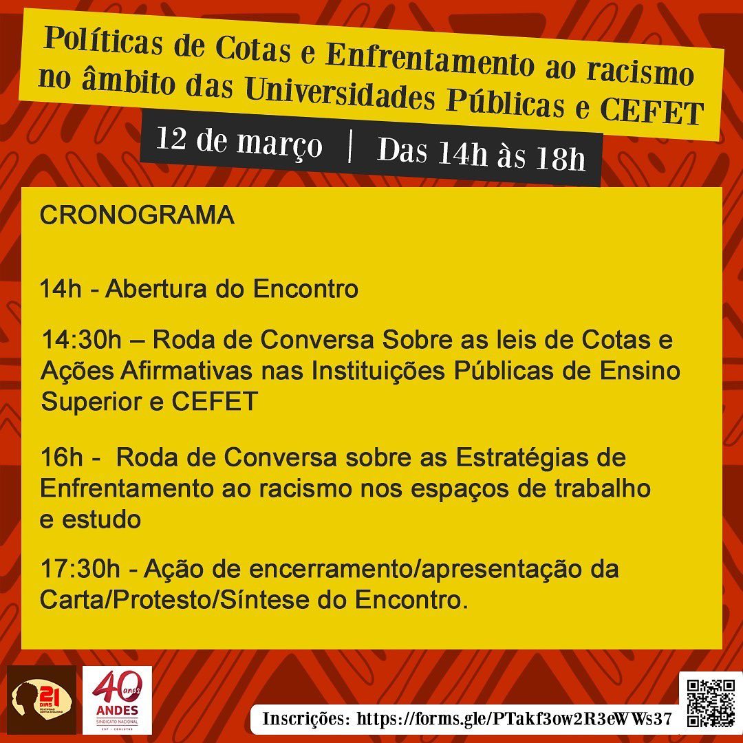 O SINTUR-RJ compartilha, apoia e convoca todos e todas para participarem do Encontro de Políticas de Cotas e Enfrentamento ao Racismo no Âmbito das Universidades Publicas e CEFET, no dia 12 de março, de 14h às 18h.