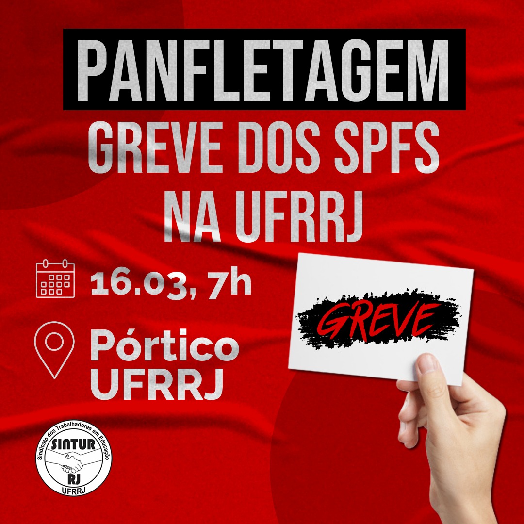 AMANHÃ, dia 16, quarta-feira, o SINTUR-RJ e a ADUR-RJ voltarão a panfletar às 7h no Pórtico de entrada da UFRRJ, com objetivo de conscientizar a categoria sobre a importância da mobilização para a Greve Geral dos Servidores Públicos Federais.