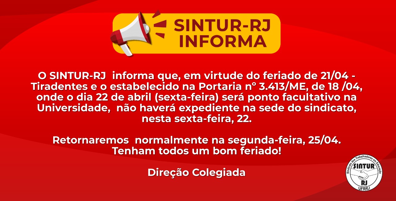 SINTUR-RJ INFORMA: PONTO FACULTATIVO 22/04 E FUNCIONAMENTO DA SEDE