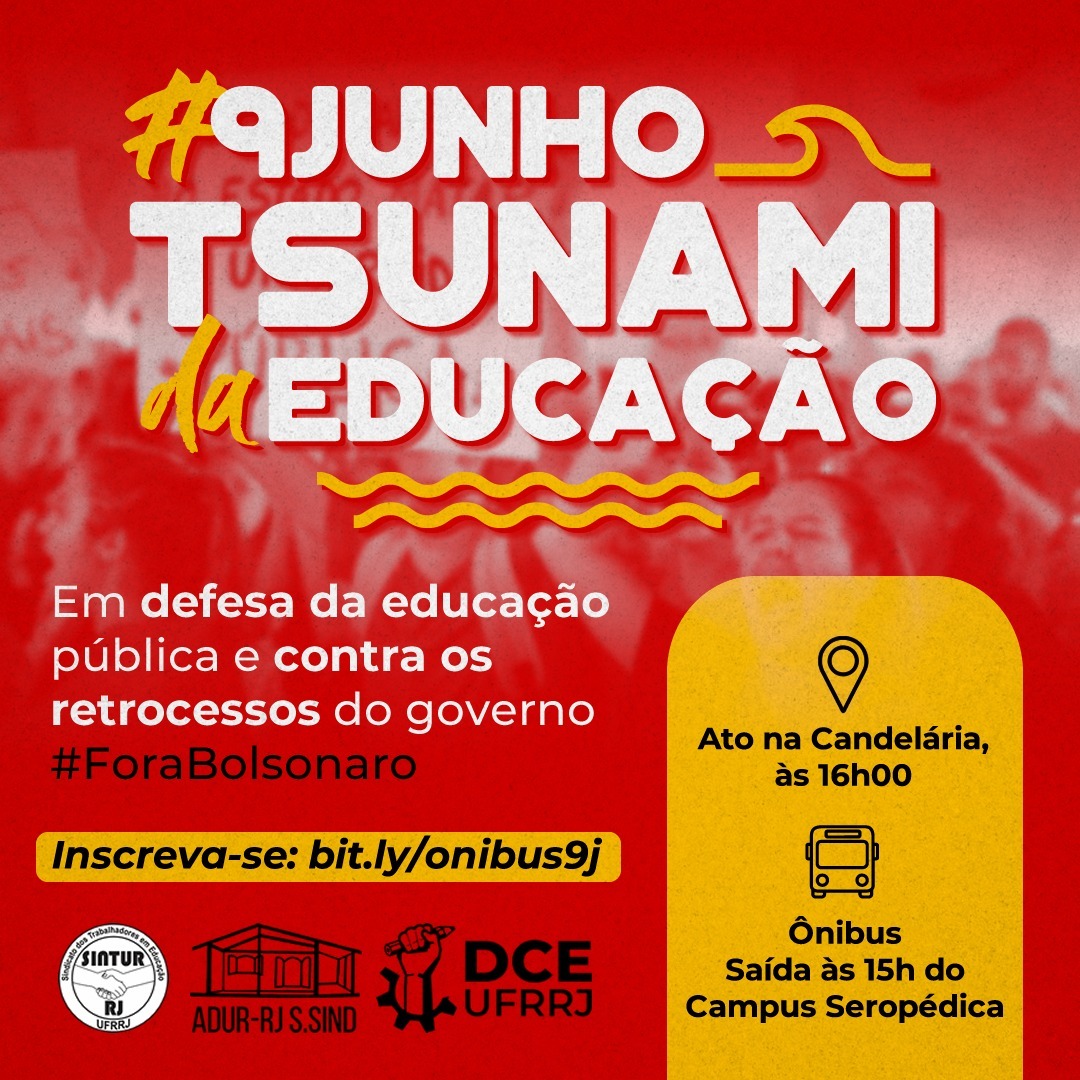 Na próxima quinta-feira (09/06/22), acontecerá o Tsunami da Educação. As entidades representativas DCE, ADUR e SINTUR estão se mobilizando conjuntamente para garantir que a comunidade esteja presente em defesa da educação pública, contra os retrocessos articulados pelo governo.