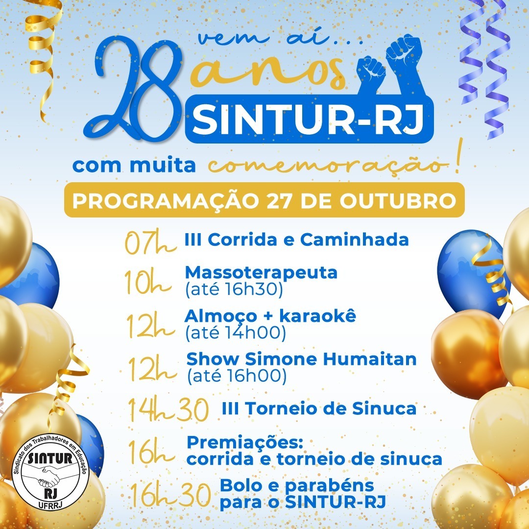 A direção colegiada do SINTUR-RJ está preparando um dia inteirinho de festa, com muito carinho para receber seus (as) associados (as) e amigos no dia 27 de outubro, em comemoração aos seus 28 anos de Luta, muita Resistência e conquistas também.