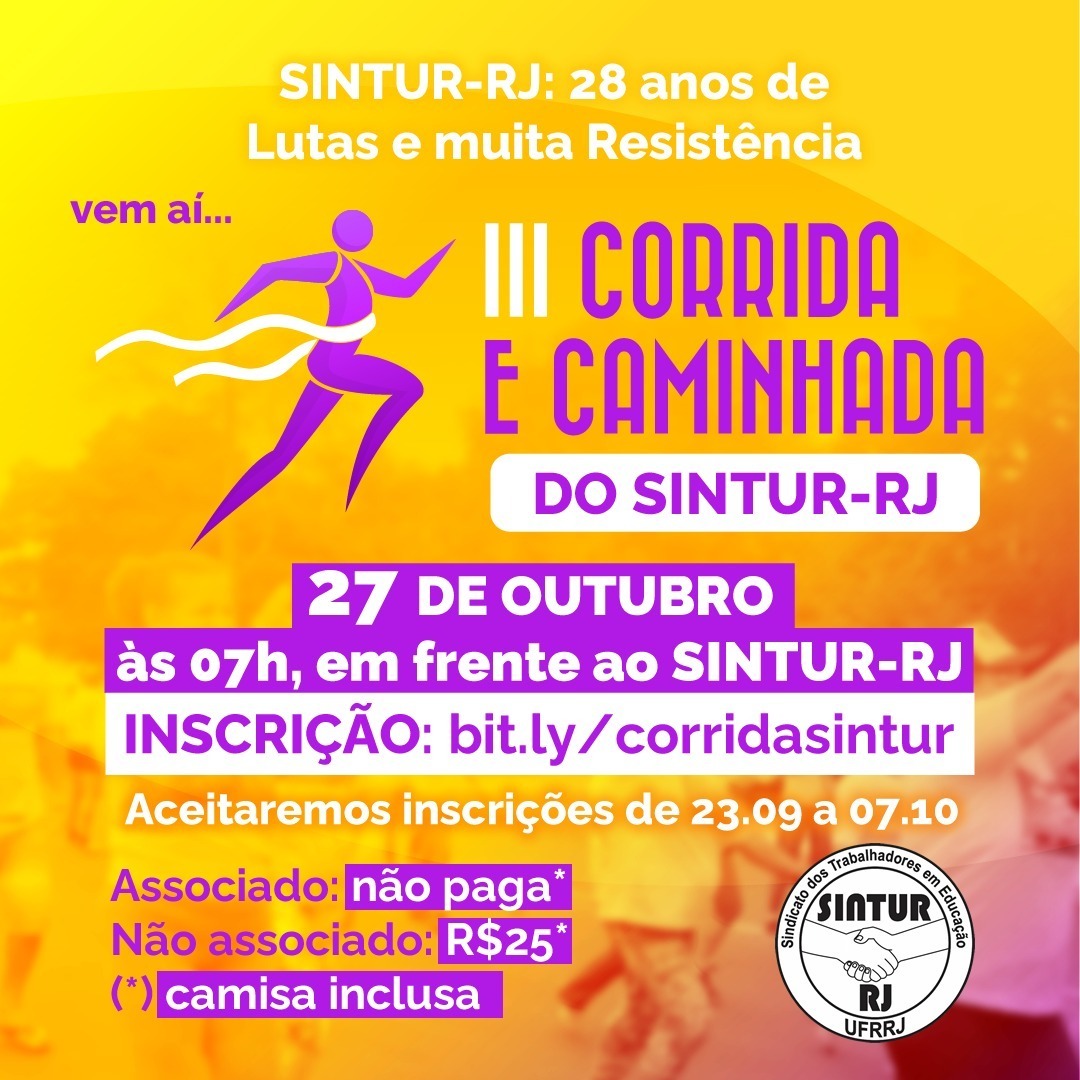 No dia 27/10 vai acontecer a III Corrida e Caminhada do SINTUR, com concentração às 07h em frente ao sindicato. Para quem está com o preparo físico em dia e apto convidamos para dar aquela corridinha matinal! Serão 5km que exigem muita disposição. Agora, para você que não pode correr, organizamos uma caminhada. Será um trajeto de 3km, bem tranquilo. Em ambos contaremos com a presença de profissionais da área.
