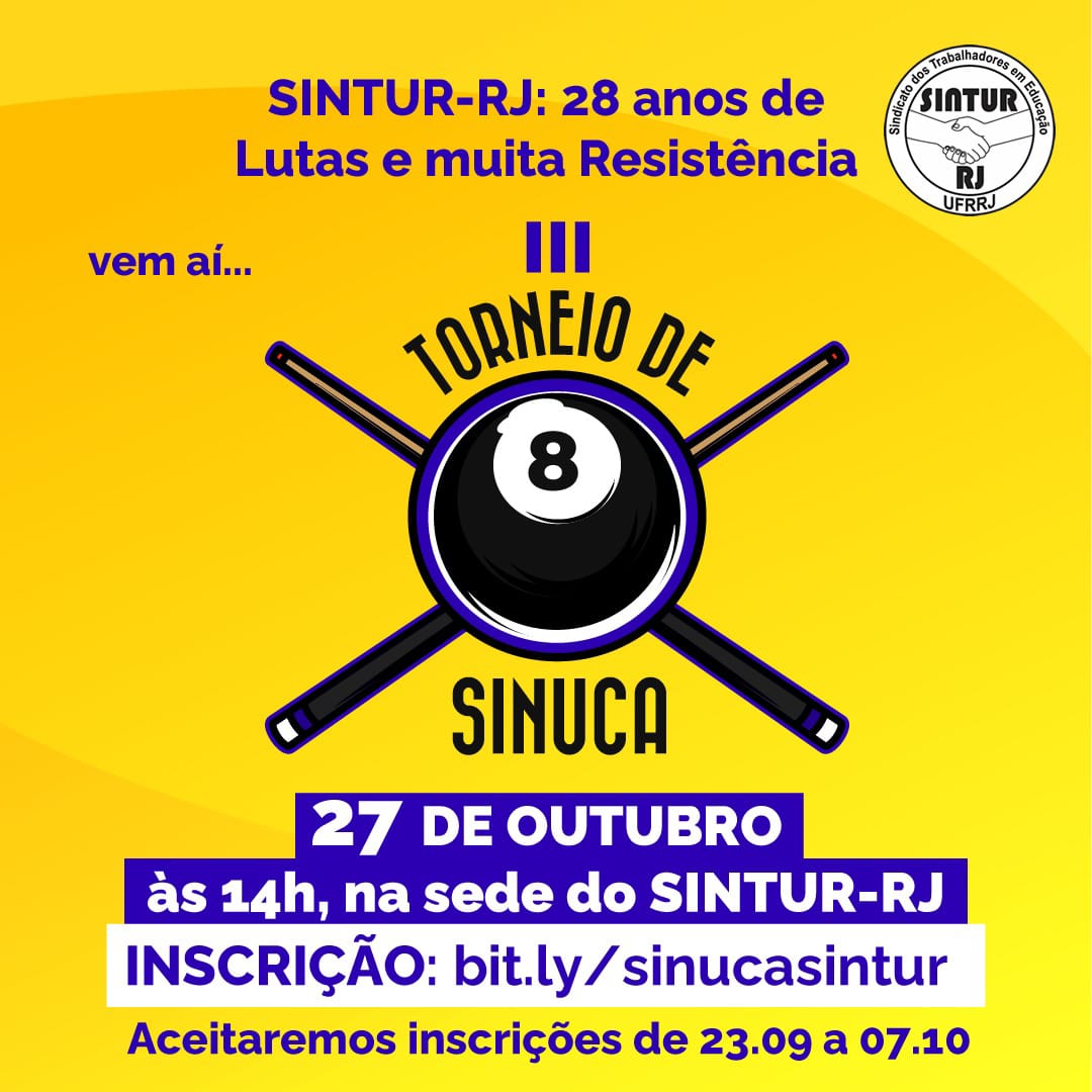 A partir das 14h começará o III Torneio de Sinuca do SINTUR-RJ com participação apenas para associados (as). Todos os participantes receberão a camiseta do evento. Interessados deverão se inscrever: bit.ly/sinucasintur