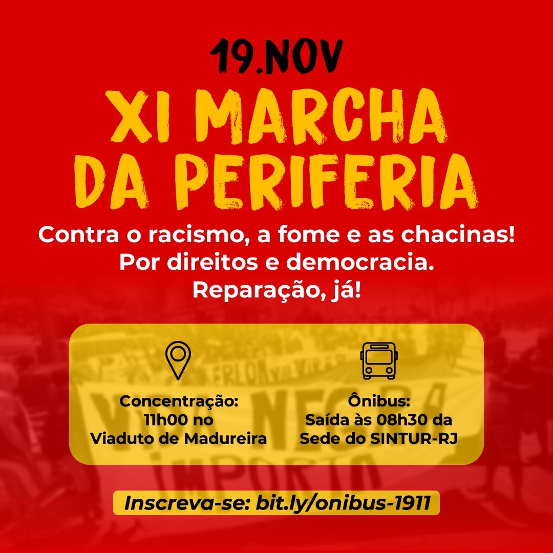 Nesse sentido, precisamos todes fazer presença na marcha da periferia que reúne diversos movimentos de esquerda e que irá realizar a marcha no dia 19/11, amanhã, às 11h, no viaduto de Madureira, no Rio de Janeiro.
