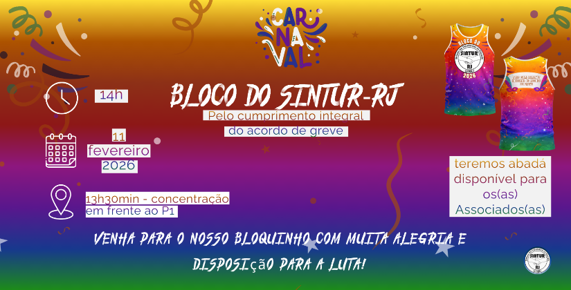 O SINTUR-RJ convida toda a categoria dos Técnico-Administrativos em Educação da UFRRJ, bem como a comunidade universitária e a população de Seropédica, para participar do Bloco de Carnaval do SINTUR-RJ – Pelo cumprimento integral do acordo de greve.