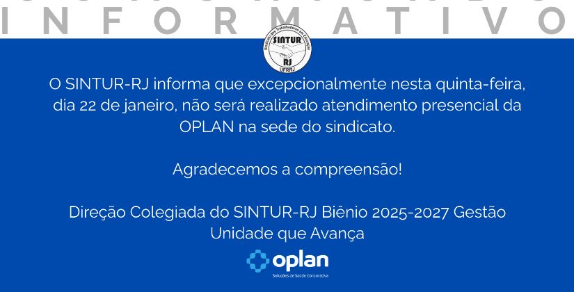 O SINTUR-RJ informa que excepcionalmente nesta quinta-feira, dia 22 de janeiro, não será realizado atendimento presencial da OPLAN na sede do sindicato.