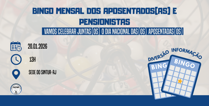 O SINTUR-RJ convida todas e todos os aposentados para participarem do Bingo dos Aposentados, que será realizado no dia 20 de janeiro, a partir das 13h, na sede do sindicato.