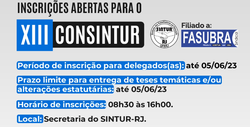 A Comissão Organizadora, no uso de suas atribuições legais, de acordo com os artigos 14º ao 23º do Estatuto, convoca os trabalhadores (as) associados (as) do SINTUR-RJ para participar do XIII CONSINTUR.
