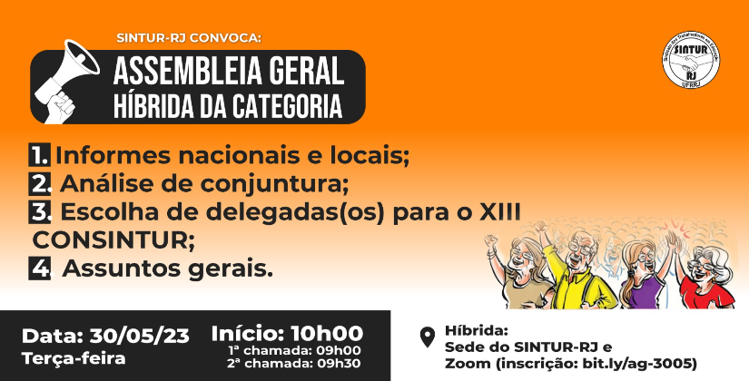 A Direção Colegiada do SINTUR-RJ convoca para Assembleia Geral Híbrida da Categoria, a ser realizada por meio de videoconferência (Zoom) e na sede do SINTUR-RJ, no dia 30/05/2023, terça-feira, com primeira chamada às 09h00, segunda chamada às 09h30 e início às 10h.