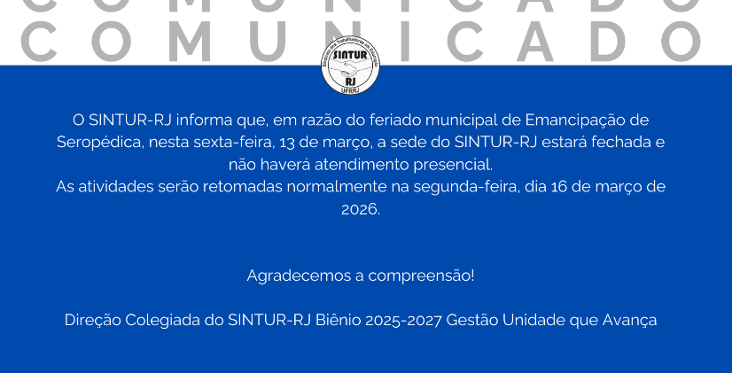 O SINTUR-RJ informa que, em razão do feriado municipal de Emancipação de Seropédica, nesta sexta-feira, 13 de março, a sede do SINTUR-RJ estará fechada e não haverá atendimento presencial.