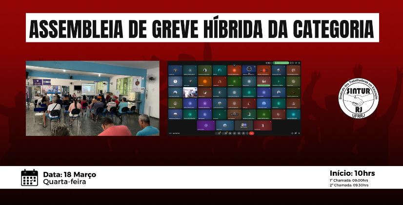 Na última quarta-feira (18), foi realizada a Assembleia de Greve Híbrida da categoria, com participação presencial na sede do SINTUR-RJ e também de forma on-line, reunindo trabalhadores e trabalhadoras para o debate coletivo sobre os rumos da mobilização.