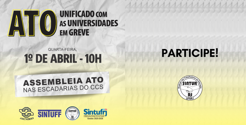 As universidades seguem em luta, e é fundamental fortalecer a mobilização conjunta da categoria! No dia 1º de abril (quarta-feira), às 10h, será realizado um importante ato unificado com as universidades do estado do Rio de Janeiro que estão em greve, reafirmando a unidade dos trabalhadores e trabalhadoras na defesa dos seus direitos.