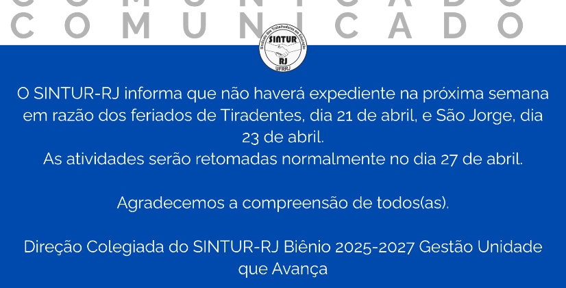 O SINTUR-RJ informa que não haverá expediente na próxima semana em razão dos feriados de Tiradentes, dia 21 de abril, e São Jorge, dia 23 de abril.