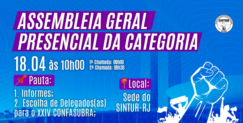 Será no dia 18 de abril de 2023 - 1ª chamada 09h, 2º chamada às 09h30min, início às 10h. Local: Sede do SINTUR-RJ