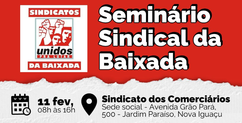 Conforme aprovado em assembleia, o SINTUR-RJ participará do Comitê Sindical da Baixada Fluminense responsável pela realização do Seminário Sindical da Baixada Fluminense, a ser realizado no dia 11.02.2023, de 08h00 às 16h00, na Sede Social do Sindicato dos Comerciários de Nova Iguaçu.