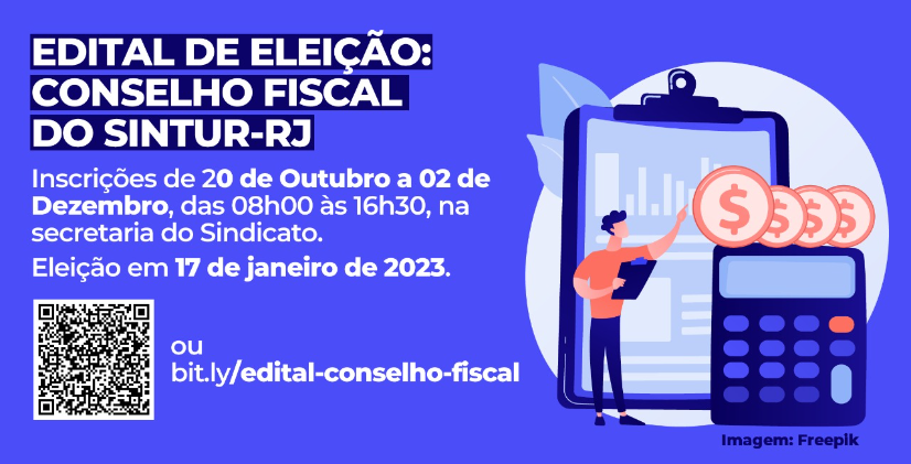 Estão abertas as inscrições para o Conselho Fiscal do SINTUR-RJ! As eleições ocorrerão em 17.01.2023, na sede do sindicato.