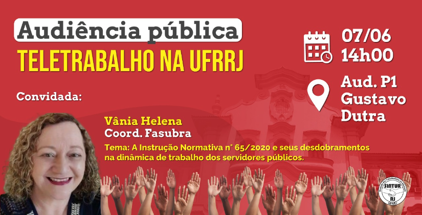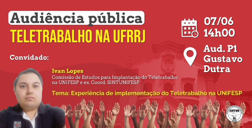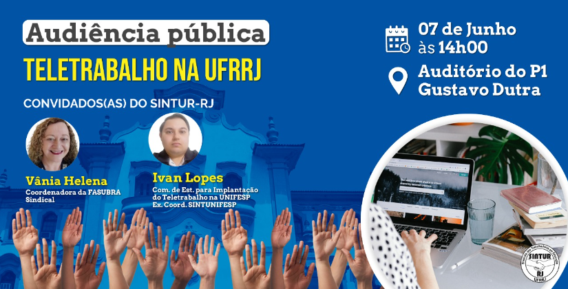 A Direção Colegiada do SINTUR-RJ biênio 2021 - 2023 e o GT-Teletrabalho convidam a Comunidade Acadêmica da UFRRJ para Audiência em 07/06, terça-feira, às 14h, no auditório Gustavo Dutra - Gustavão, P1.