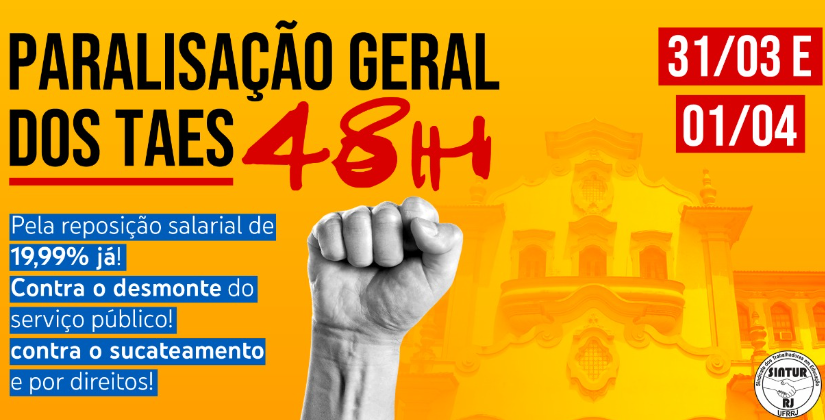 A categoria Técnico-Administrativos em Educação da UFRRJ, conforme deliberado em assembleia realizada na última quinta-feira, 24, vão PARALISAR SUAS ATIVIDADES POR 48H, nos dias 31/03 e 01/04 e dois representantes da categoria participação da caravana “Ocupa Brasília”.