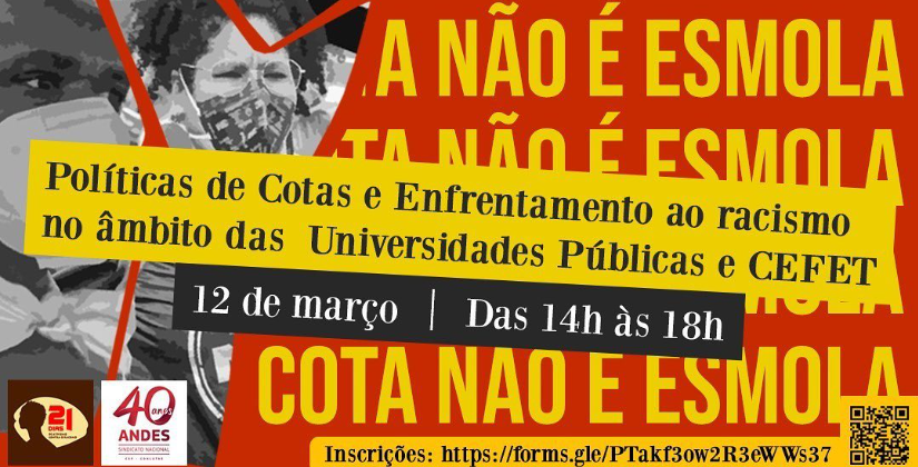Encontro de Políticas de Cotas e Enfrentamento ao Racismo no Âmbito das Universidades Publicas e CEFET, no dia 12 de março, de 14h às 18h.