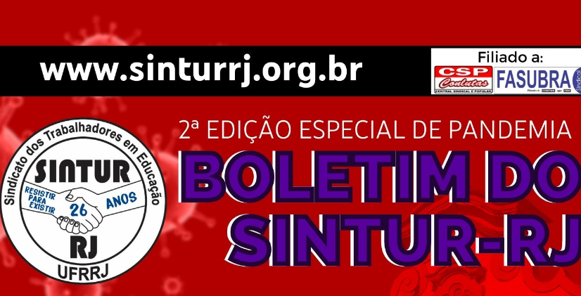 Desde o início da pandemia do covid-19, todos os dias, durante as 24 horas, TAES estiveram trabalhando presencialmente, através de escalas de revezamento, plantões ou em suas residências exercendo trabalho remoto. E não foi diferente com a direção do SNTUR-RJ, tivemos que nos reinventar para manter o Sindicato vivo e atuante e é isso que você vai rever nessa 2ª Edição Especial de Pandemia do Boletim do SINTUR-RJ.