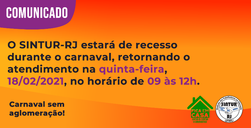 O SINTUR-RJ estará de recesso durante o carnaval, retornando o atendimento na quinta-feira, 18/02/2021, no horário de 09 às 12h.