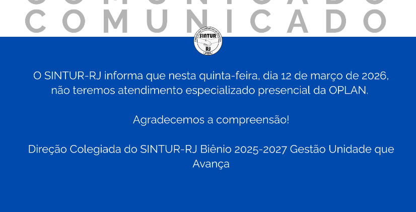 O SINTUR-RJ informa que nesta quinta-feira, dia 12 de março de 2026, não teremos atendimento especializado presencial da OPLAN.