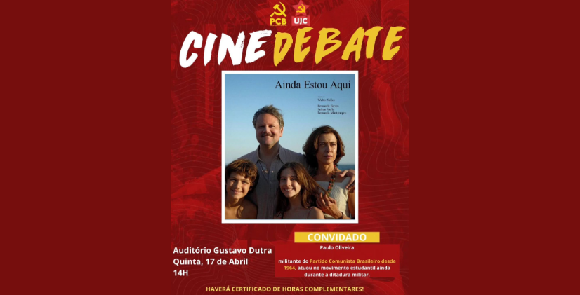 SINTUR-RJ convida todos e todas a prestigiar o cinedebate do filme "Ainda Estou Aqui", organizado pela União da Juventude Comunista (UJC) da UFRRJ, em memória aos 61 anos do golpe empresarial-militar no Brasil. O evento contará com a presença de Paulo Oliveira, militante do PCB desde o período da ditadura, que trará importantes reflexões sobre esse capítulo da nossa história.