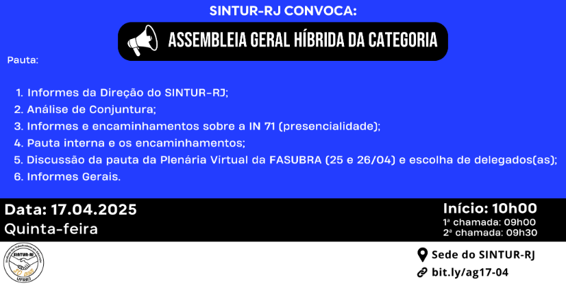 Convocamos a todos os servidores para participar da assembleia, que vai acontecer no dia 17/04 (quinta-feira), a partir das 10h00. Todos(as) os(as) trabalhadores(as) da categoria são bem-vindos, filiados e não filiados ao sindicato.