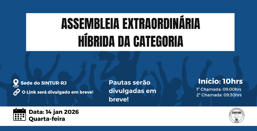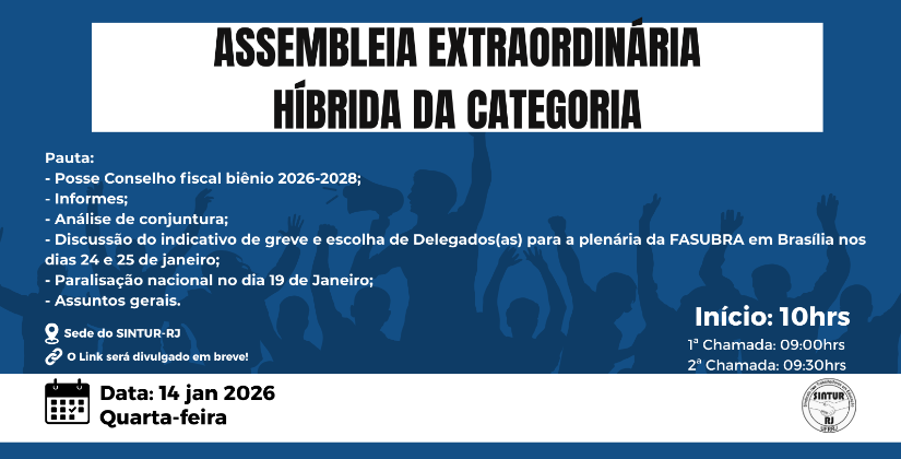 Convocamos a todas as servidoras e todos os servidores para participar da assembleia, que vai acontecer no dia 14 de janeiro, QUARTA-FEIRA, a partir das 10h00.