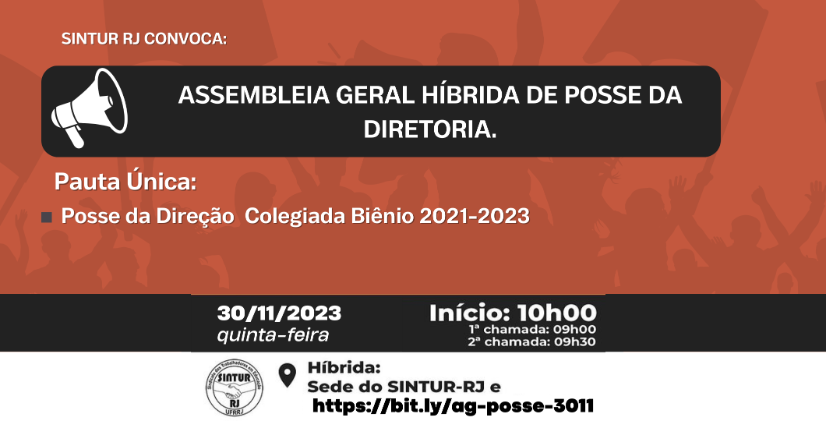 A Direção Colegiada do SINTUR-RJ convoca os(as) associados(as) do SINTUR-RJ para Assembleia Híbrida de Posse da Diretoria Biênio 2023-2025, a ser realizada por meio de videoconferência (Zoom) e na sede do SINTUR-RJ.