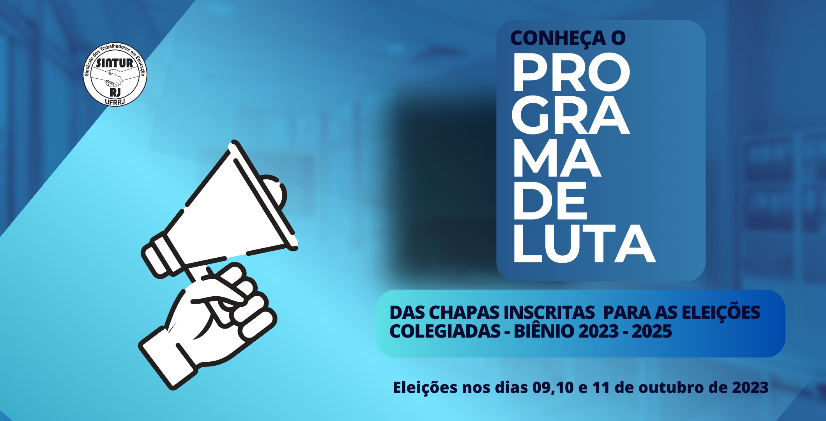A comissão eleitoral, no uso de suas atribuições legais em conformidade com os Artigos 86° à 123° do Estatuto em vigor, torna público os programas de luta da CHAPA 01 - SINDICATO É PRA LUTAR! POR UM SINTUR-RJ DE LUTA e da CHAPA 02 - NOVA REALIDADE NA LUTA, às eleições para direção Colegiada do SINTUR-RJ - Biênio 2023 - 2025, que acontecerão nos dias 09, 10 e 11 de outubro de 2023.