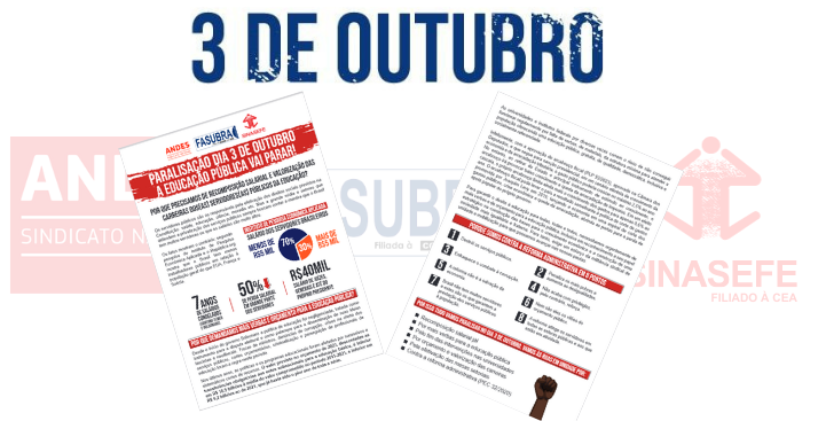 As entidades da educação federal (Andes-SN, Fasubra e SINASEFE) divulgam nesta sexta-feira (29/09) um panfleto conjunto da Paralisação Nacional da Educação Federal, convocada para 3 de outubro. O material apresenta dados sobre os salários defasados de servidores(as), reforça motivos para lutar em defesa de mais investimento na educação pública e enumera oito pontos contrários à Reforma Administrativa (PEC 32/2020).