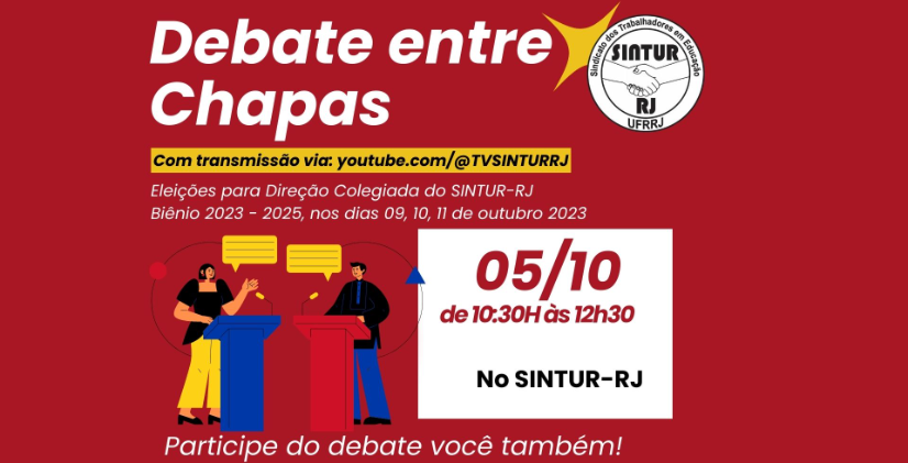 A comissão eleitoral, no uso de suas atribuições legais em conformidade com os Artigos 86° à 123° do Estatuto em vigor, convoca a categoria para participar do debate entre as chapas inscritas CHAPA 01 - SINDICATO É PRA LUTAR! POR UM SINTUR-RJ DE LUTA e da CHAPA 02 - NOVA REALIDADE NA LUTA às eleições para direção Colegiada do SINTUR-RJ - Biênio 2023 - 2025.