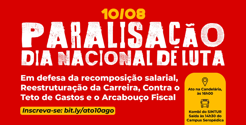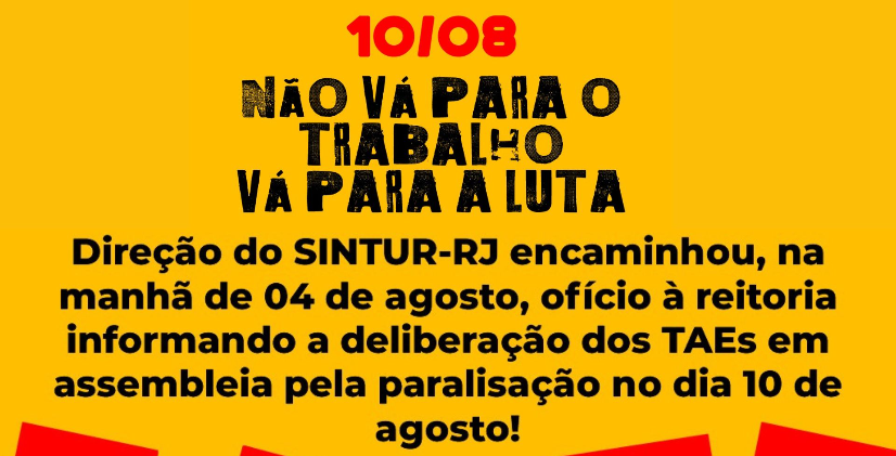 A assembleia Geral Híbrida Extraordinária da categoria do SINTUR-RJ, na última quarta-feira , 02/08, deliberou por paralisação de 24 horas na UFRRJ para o dia 10 de agosto, próxima quinta-feira.