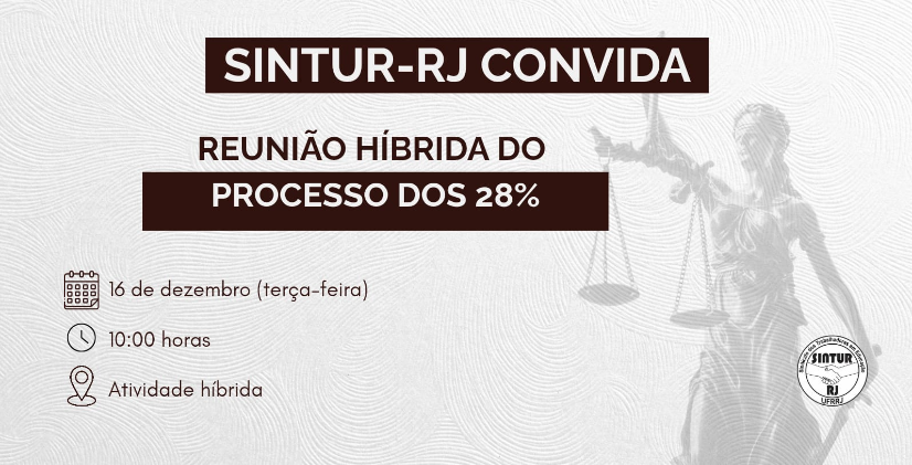 O SINTUR-RJ informa que nesta terça-feira (16/12) será realizada, em colaboração com a Coordenação Jurídica, Reunião Híbrida com o objetivo de instruir e orientar os interessados no Processo dos 28,86% sobre o procedimento de Individualização da Execução como proposta pelas Advogadas que representam o coletivo que integra a ação.