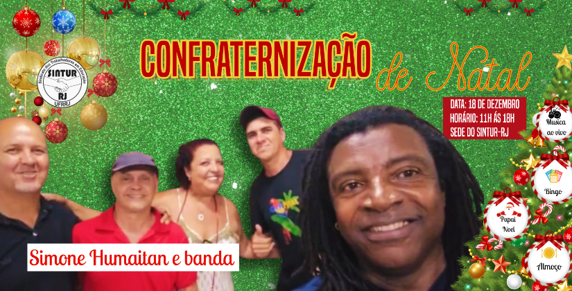 O SINTUR-RJ convida a todas (os) associadas (os) a estarem conosco na nossa Confraternização de Natal e juntos celebrarmos as vitórias do ano que se finda e recarregar as baterias para as lutas do ano que vai se iniciar!