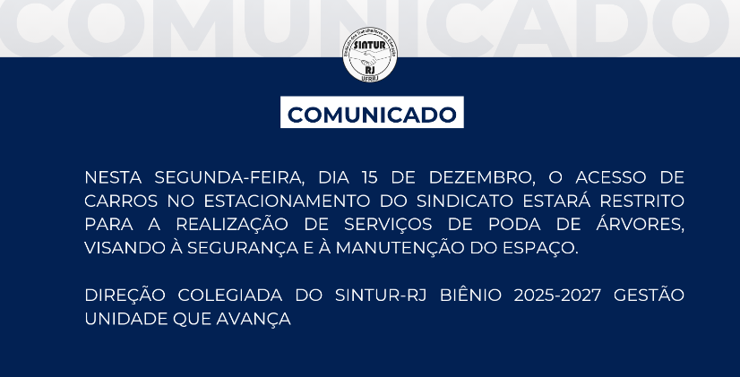 Nesta segunda-feira, dia 15 de dezembro, o acesso de carros no sindicato estará restrito para a realização de serviços de poda de árvores, visando à segurança e à manutenção do espaço.