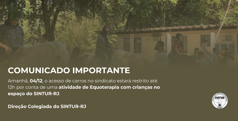 Nesta quinta-feira, dia 4 de dezembrom, o acesso de carros no sindicato estará restrito até 12h por conta de uma atividade de Equoterapia com crianças no espaço do SINTUR-RJ.