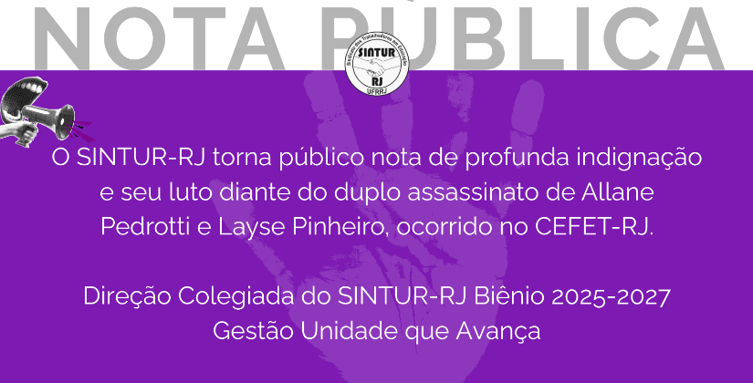 O SINTUR-RJ torna público nota de profunda indignação e seu luto diante do duplo assassinato de Allane Pedrotti e Layse Pinheiro, ocorrido no dia 28 de novembro de 2025, na unidade Maracanã do Centro Federal de Educação Tecnológica Celso Suckow da Fonseca (CEFET-RJ)