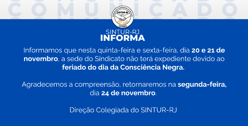 Informamos que nesta quinta-feira e sexta-feira, dia 20 e 21 de novembro, a sede do Sindicato não terá expediente devido ao feriado da Consciência Negra.