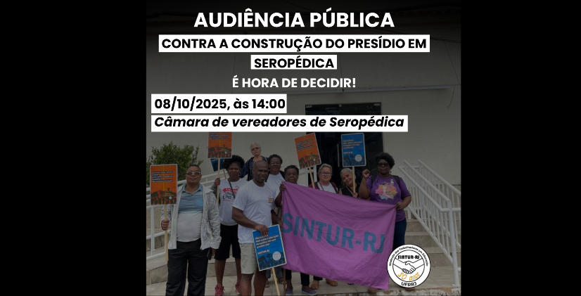 O SINTUR-RJ convoca todas e todos para a Audiência Pública contra a construção do Complexo Prisional em Seropédica, que acontecerá no dia 8/10, às 14h, na Câmara Municipal de Seropédica.